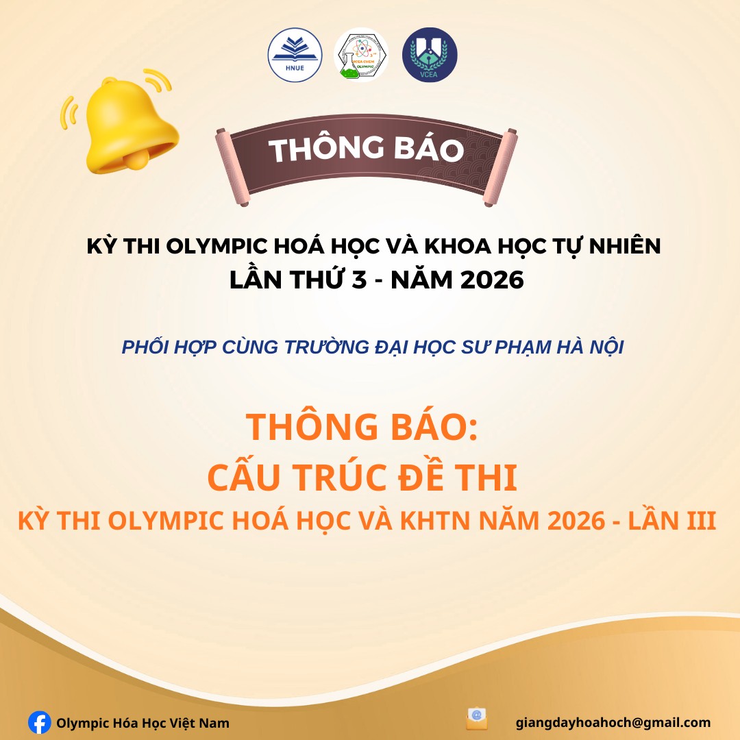 Ban Tổ chức Kỳ thi Olympic Hoá học và Khoa học Tự nhiên trân trọng thông báo cấu trúc đề thi của kỳ thi Olympic Hoá học và Khoa học Tự nhiên năm 2026 – Lần III, nhằm giúp thí sinh và các đơn vị chuẩn bị kế hoạch ôn tập phù hợp.